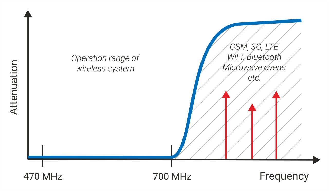 Today's RF spectrum is full of signals which can cause intermodulation and decrease range of your wireless system. These signals can be LTE - high speed mobile internet (now starts to occupy spectrum above 700 MHz), then 3G, GSM, bluetooth and WiFi to name a few.