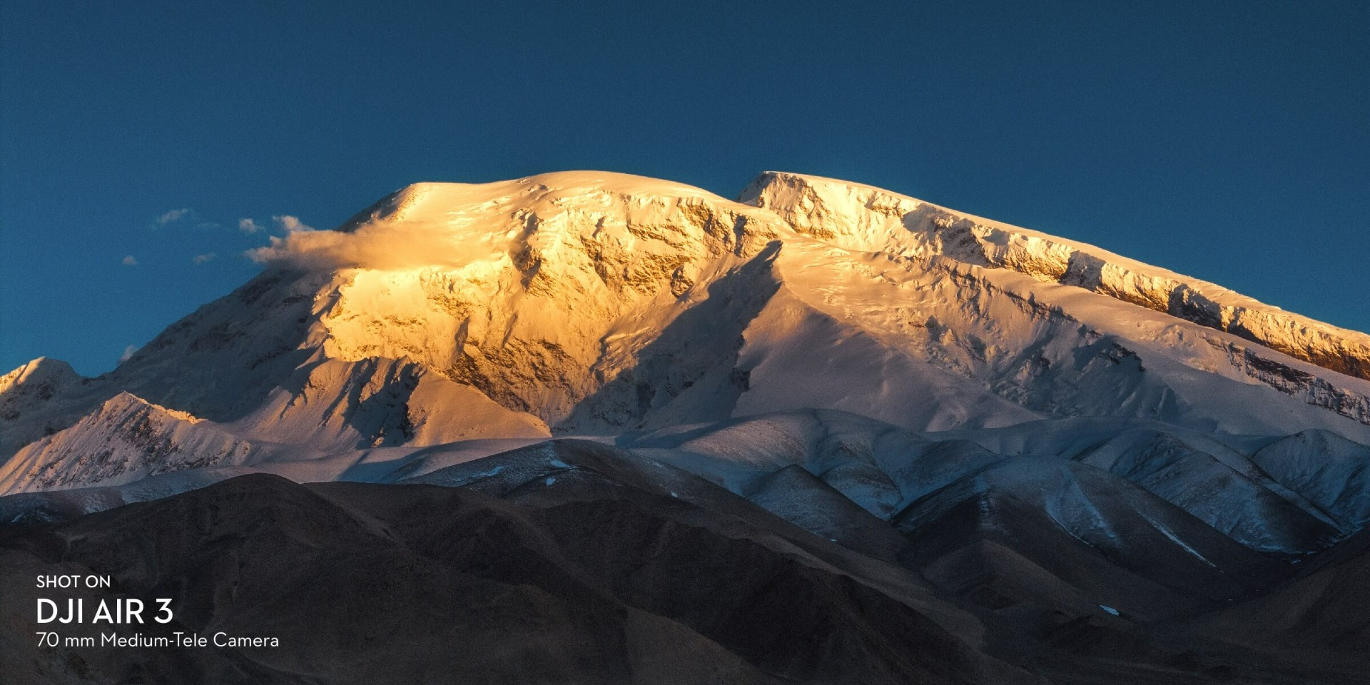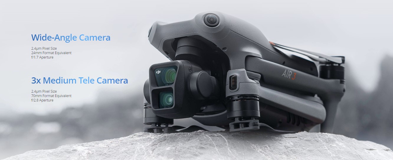 by DJIAir 3 boasts the first dual-primary camera system of the Air series, embedding a 1/1.3-inch-CMOS wide-angle camera and a 1/1.3-inch-CMOS 3x medium tele camera in a sleek and compact body.