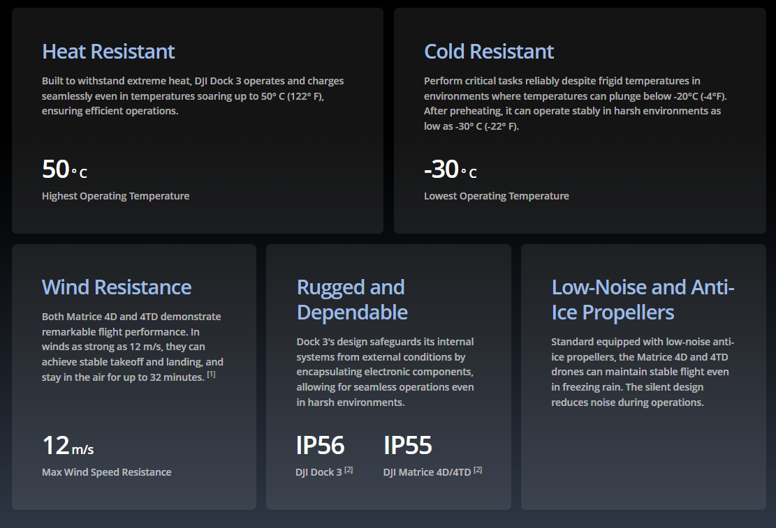 2. DJI Dock 3 is IP56 rated, and the DJI Matrice 4D/4TD is IP55 rated. Both were tested under controlled laboratory conditions, with the dock's distribution cabinet door closed and screws tightened. The IP rating is not permanently effective and may decrease due to product wear and tear.