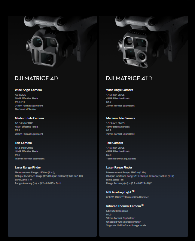 The all-new water and dust-resistant DJI Matrice 4D and 4TD are specifically designed for DJI Dock 3, offering extended flight time, and can pair with DJI RC Plus 2 Enterprise for standalone use. Both drones are equipped with a wide-angle camera, a medium tele camera, a tele camera and a Laser Range Finder. Matrice 4D is highly effective for professional high-precision mapping and detailed surface inspections. Matrice 4TD is equipped with an infrared thermal camera and a new NIR auxiliary light, making it suitable for a wide range of applications such as infrastructure inspections, emergency response, and public safety.