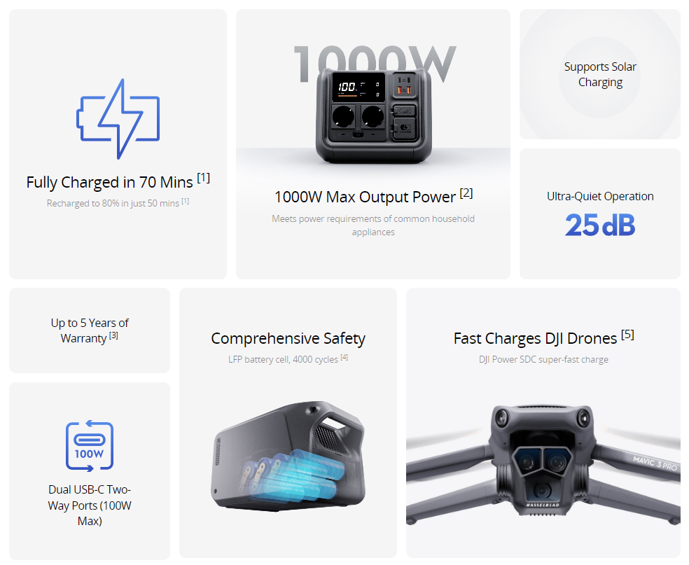 Thanks to its comprehensive safety design, DJI Power 500 has gained the high-quality portable power station certification from SGS Switzerland, and received 26 product test certifications, including 2 product test verifications, 4 mechanical performance tests, 9 electrical performance tests, 3 environmental resistance tests, 5 noise-level tests, and 3 intelligent and efficient DC power-supplying and recharging tests.