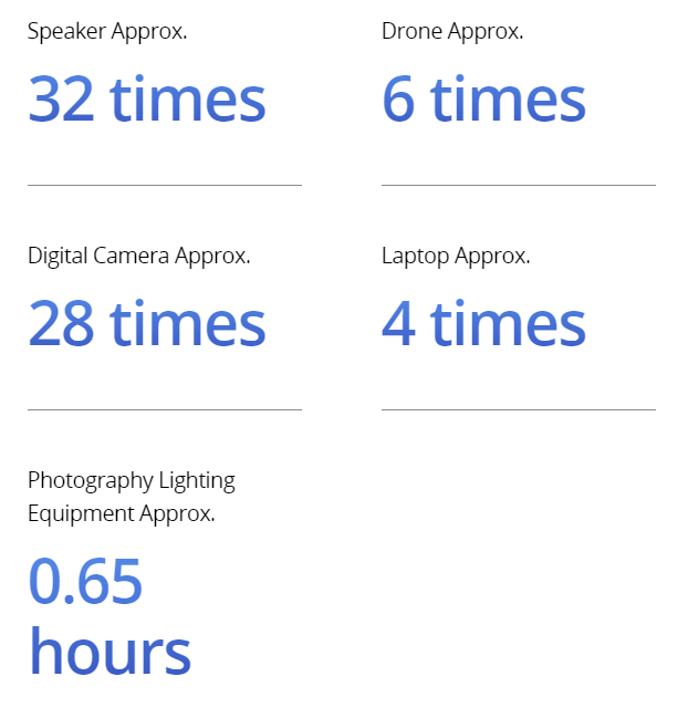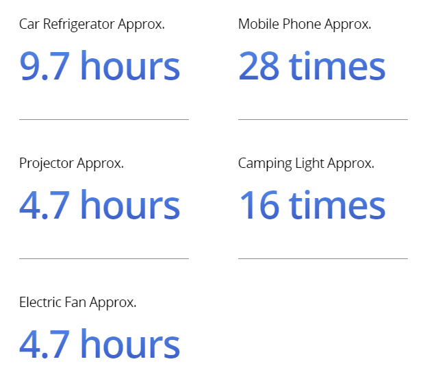 | Measured at 25℃/77°F room temperature, being recharged in the 270W Standard Recharge Mode, and at an output power of 500 W. | |