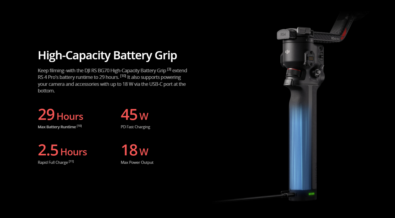 Equipped with carbon fiber axis arms, DJI RS 4 Pro boasts a 4.5kg (10lbs) payload capacity as well as robust power and torque, easily accommodating mainstream mirrorless/cinema camera and lens setups.