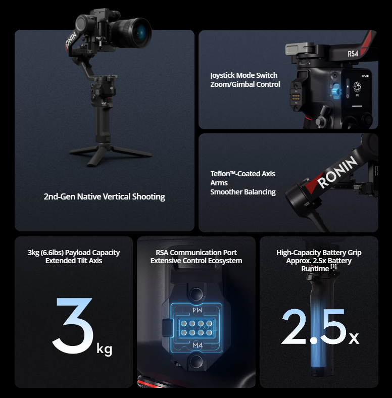 - DJI RS 4 features a Teflon™ coating for all three axes, resulting in reduced friction and smoother balancing.