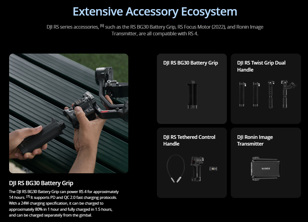 DJI RS 4 introduces an RSA communication port, which allows for the connection of accessories such as the DJI RS Tethered Control Handle [6] and third-party accessories like control handles [6] and remote-control ring handles. [6] You can flexibly switch between different shooting setups according to your creative needs.