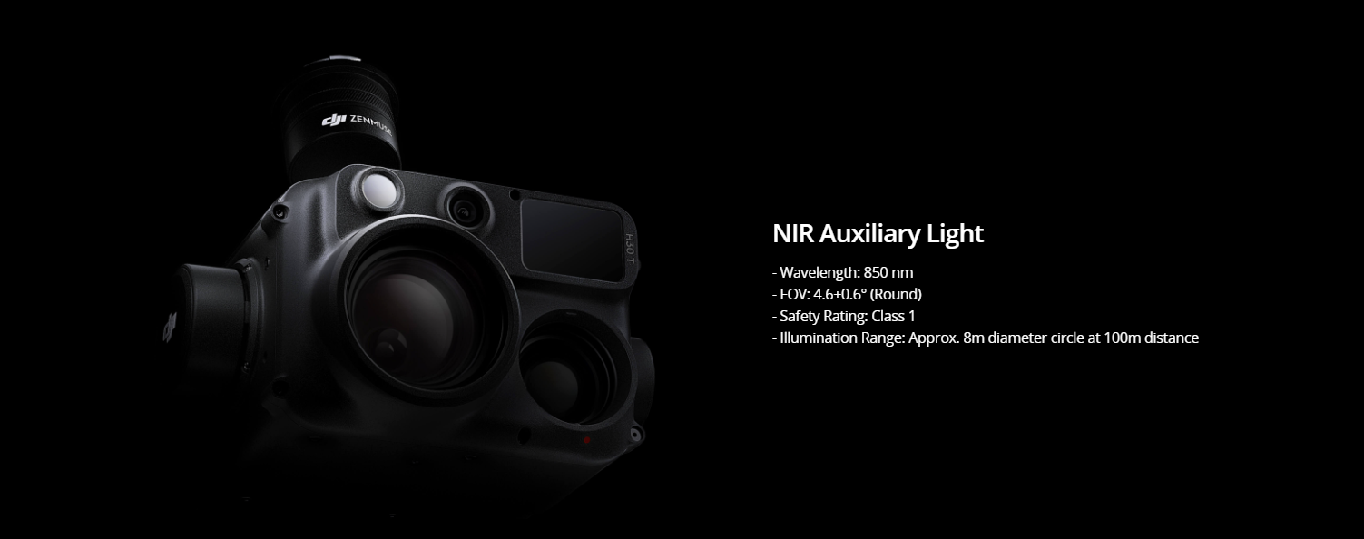 In Night Scene mode, the Zenmuse H30 Series zoom camera supports IR Light for infrared enhancement and NIR illumination. It switches the live feed to a grayscale image by removing the IR filter, thereby strengthening the contrast between light and dark areas, making it easier to locate subjects. When the NIR auxiliary light is enabled, the zoom camera can benefit from additional NIR illumination, which is especially helpful for covert night surveillance and search-and-rescue operations.