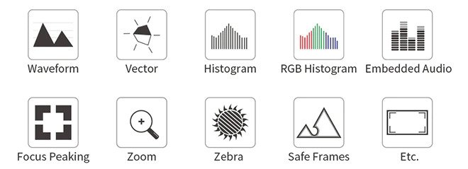 The monitor includes a plethora of useful features such as histogram, false color, focus assist, embedded audio, pixel to pixel, frame guides, nine grid etc. As well as a flexible 3D LUT implementation (use built-in LOG to Rec.709 video or upload .cube files). And both screens can be set independently!