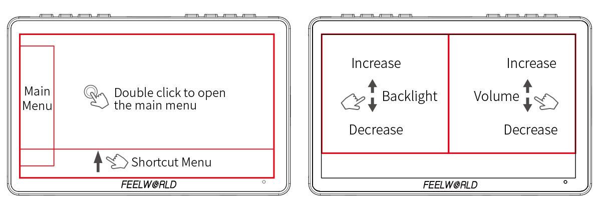 You can touch the screen or physical buttons to browse the menu and set functions. F5 Pro V4's key distribution design is simple and easy to operate. At the top of the monitor, there are 2 custom function buttons, you can set them as commonly used functions. You can also set the shortcut function of the left and right keys directly in the menu setting function, which can be set to backlight adjustment or volume adjustment, directly press "﹤" to decrease the value; directly press "﹥" to increase the value. And the monitor will automatically save the parameters you have previously set, and keep the original settings when you turn it on next time. It does not need to be reset, which is convenient and simple.
