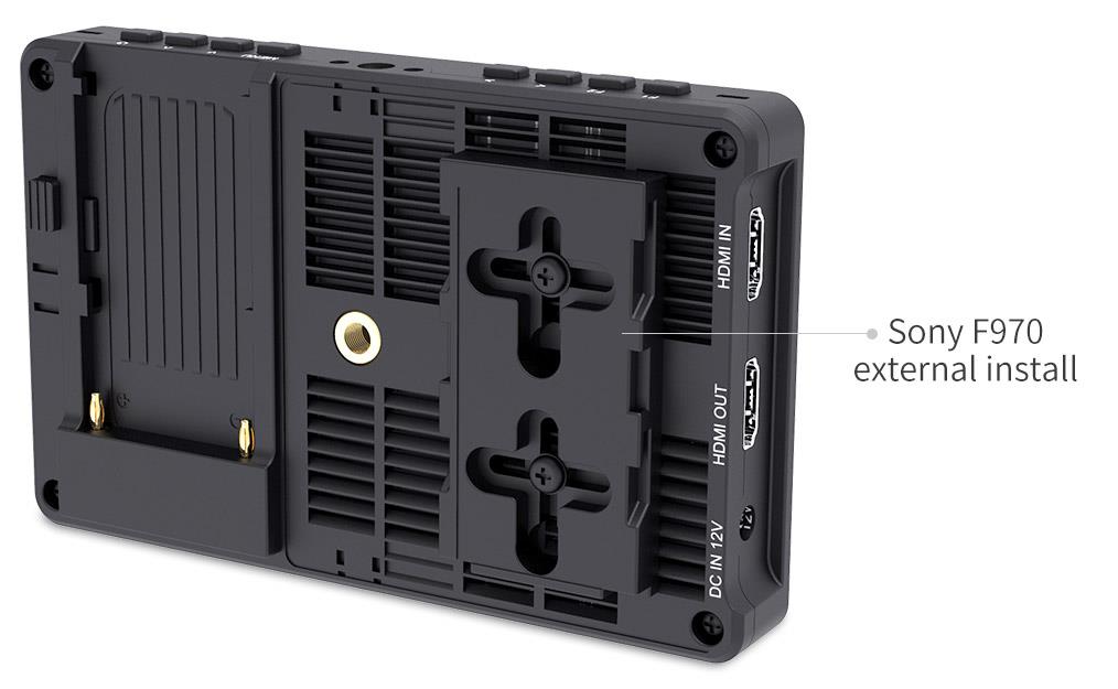 A Sony F970 external install and power kit design is added to the back of the monitor. The external kit can be used to install and install the external equipment, like wireless transmitter, LED light, video converter and others which can be powered by Sony F970 battery. This innovative external power supply design reduces the need for photographers to connect to external wireless transmission, LED light and other equipment, greatly saving the space occupied by the equipment and reducing the weight of photography equipment.