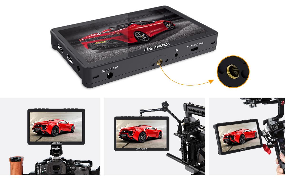 F5 Pro V4 features standard 1/4" mount points (top, bottom, right, middle back) for attaching it to cameras and rigs. Not only you can install it on a monitor through tilt arm, but also you can mount it on a handheld stabilizer or securely attach it to the top of your camera as the ultimate HD viewfinder! If you install it on the bottom of the device, you can also combine the image flip function to maintain the correct orientation of the screen!