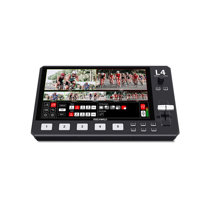Live-switch, control, and stream your video content using one SDI and up to four HDMI video sources using the L4 HDMI Livestream Switcher with Built-In 10.1" LCD Monitor from FeelWorld.
