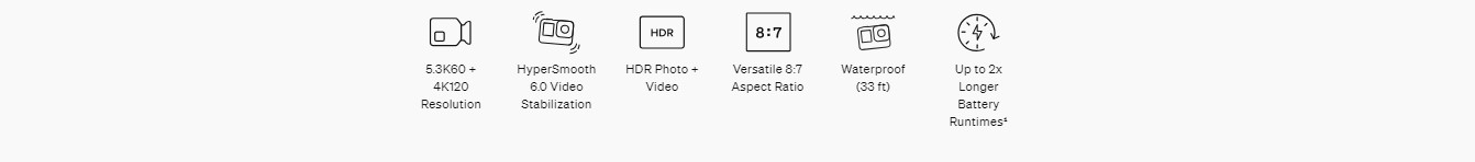 | CONNECTED FEATURES | UPLOADS AUTOMATICALLY TO THE CLOUD + GET A HIGHLIGHT VIDEO AUTOMATICALLY WITH GOPRO SUBSCRIPTION | WI-FI + BLUETOOTH® |
