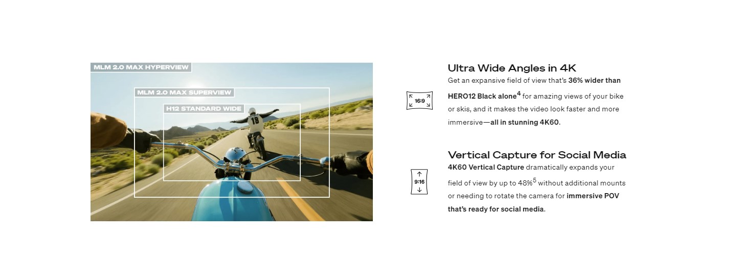 HyperView and SuperView—both GoPro exclusive digital lenses—enable ultra wide 16:9 capture, standard in HERO12 Black. For even wider shots, consider the new Max Lens Mod 2.0 accessory (see above).