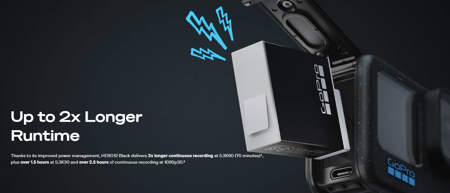 Using advanced technology, the long-lasting Enduro Rechargeable Battery boosts performance in cold temperatures over previous GoPro cameras and batteries.