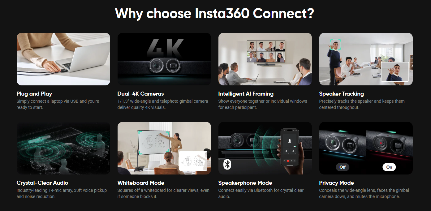 Insta360 Connect is an all-in-one, dual 4K-camera AI video bar with exceptional audio and video quality, a game-changer for small and medium-sized meeting rooms.