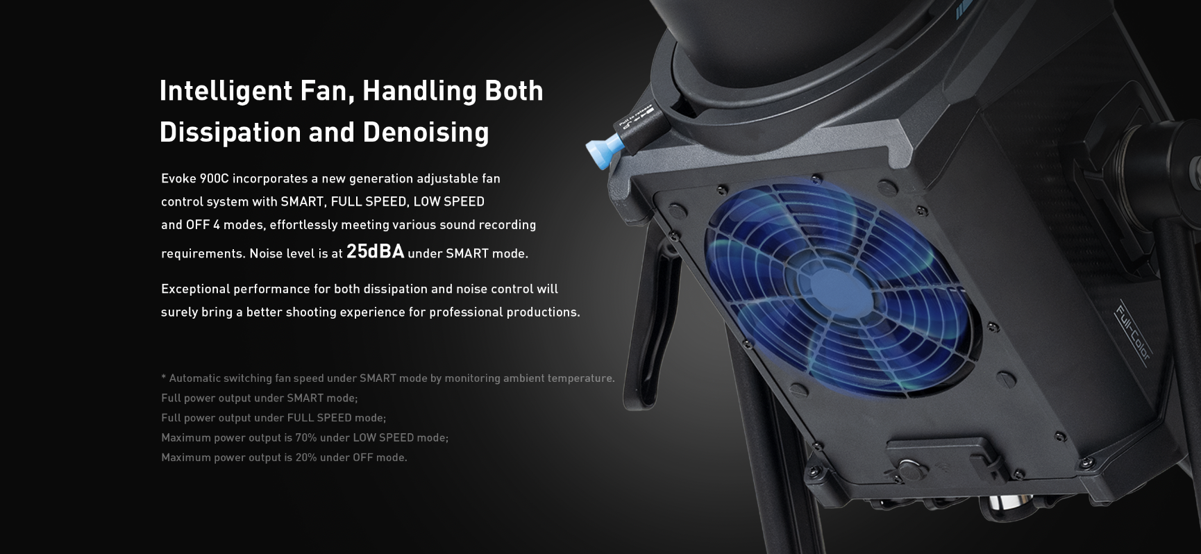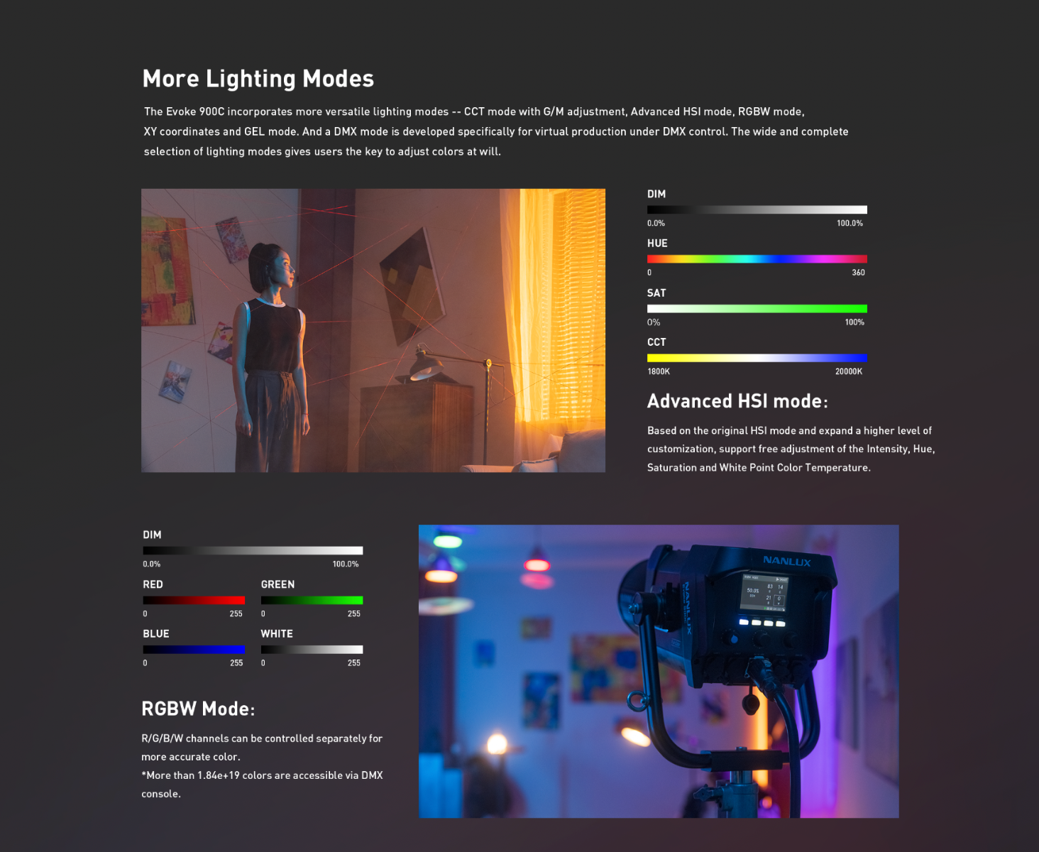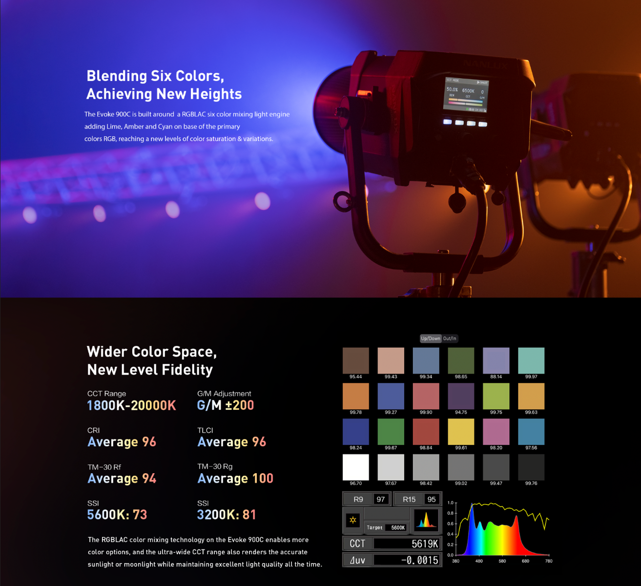 able 1800 to 20,000K CCT allows you to use it on interiors, exteriors, and mixed lighting environments. The Evoke 900C is dimmable from 0 to 100% in ultra-precise increments of just 0.1%. Besides incorporating lime, amber, and cyan LEDs, the light offers high CRI/TLCI ratings of 96 as your assurance of accuracy in color rendering.