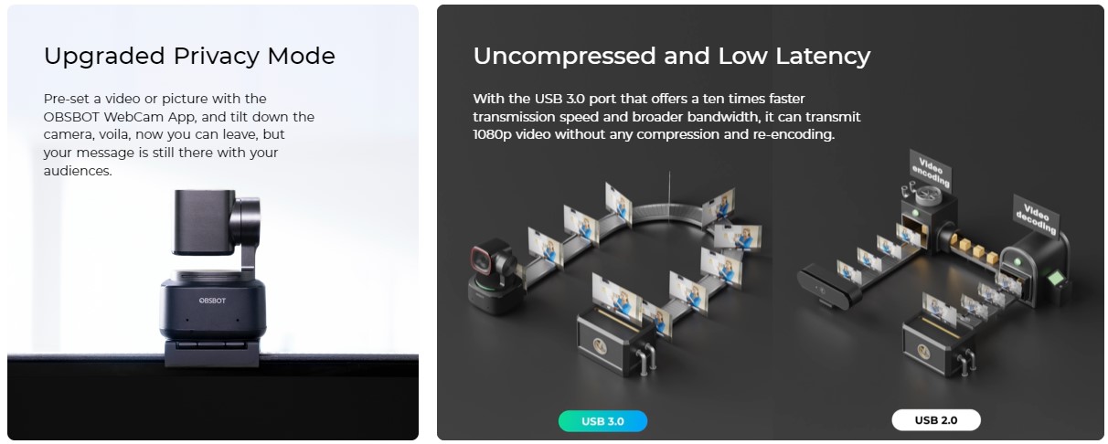 The Tiny 2 updates its features from the Tiny 4K in many areas, including a more powerful 1/1.5" CMOS 50MP sensor; updated AI auto-zoom, zone, and hand tracking with auto-framing; enhanced PixGain HDR support, dual-native ISO for high-quality low-light performance, 10x faster data transmission over USB 3.1 Gen 1, dynamic gesture control, and an enhanced sleep mode.
