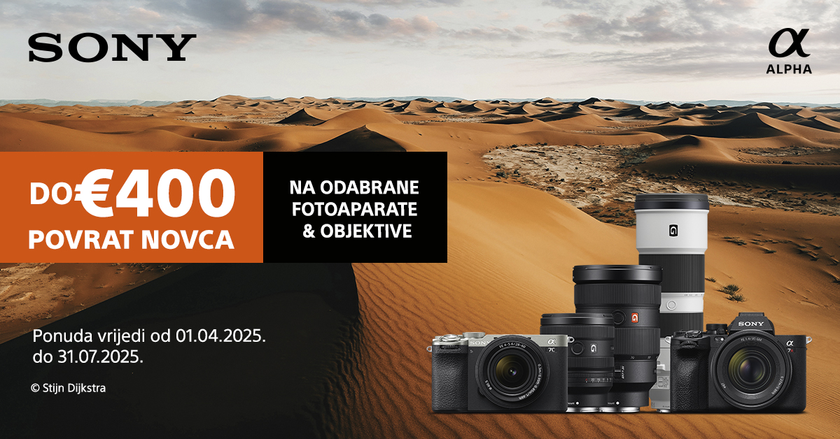 Ostvarite Cashback nakon kupnje odabranih Sony fotoaparata i objektiva. Iznosi Cashbacka, kao i proizvodi uključeni u promociju, navedeni su u tablici niže. Promotivna aktivnost vrijedi za sve kupovine ostvarene u razdoblju od 01.04.2025. do 31.07.2025. (uključujući i 31.07.2025). Zahtjev je potrebno podnijeti najranije trideset (30) dana nakon datuma kupnje, a najkasnije do 30.09.2025. (do 23:59).