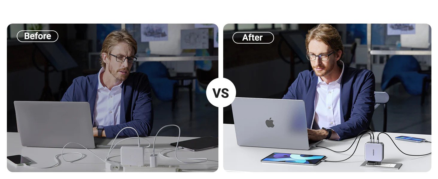 - 3-in-1 Multiport Charging: Two USB-C ports and one USB-A port support charging two laptops and a phone simultaneously at speeds necessary for a multi-device tech user. 5FT 240W fast charging Type-C to C cord included